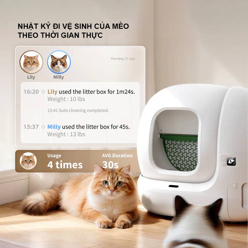 • Các cảm biến trọng lượng tích hợp phân biệt mèo dựa vào cân nặng của chúng, điều này rất hữu ích đối với các gia đình nuôi nhiều mèo.